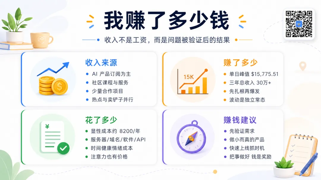 但回头看,真正重要的节点不是某一天赚了多少钱,而是我开始一次次把想法变成产品,把产品交给用户,把反馈变成下一次判断。