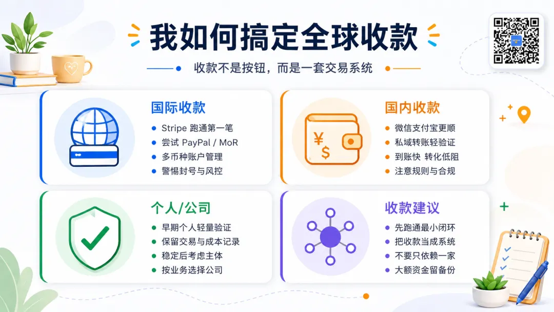 后来真的收到海外用户的钱,我才发现,收款其实是一套系统:你要知道用户怎么付、平台怎么审、钱在哪里停、什么时候能到账、出了退款和拒付怎么办。