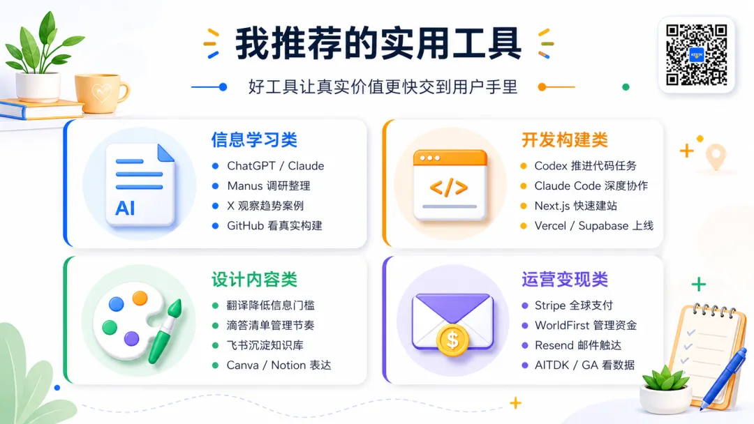 后来我慢慢意识到,工具不是越多越好。对 AI 独立开发者来说,真正有价值的工具,应该能帮你完成四件事:更快获取信息、更快做出产品、更好表达和传播、更稳定完成商业闭环。