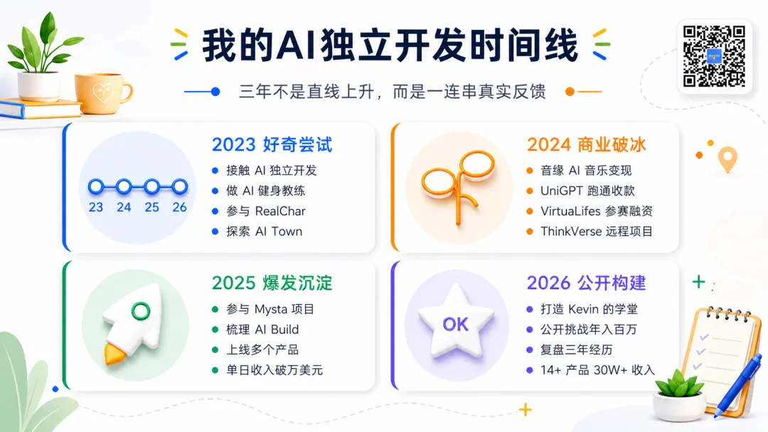 下面这条时间线,不是为了证明我一路顺利,而是想还原一个普通独立开发者,如何一点点把 AI、产品、收款、内容和商业闭环跑起来。