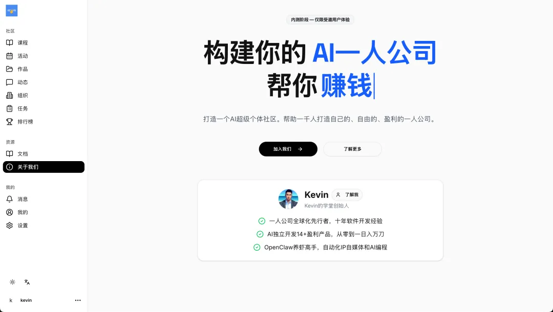 如果你也想开始做 AI 一人公司,欢迎加入【Kevin的学堂】,详细信息可以查看社区官网。