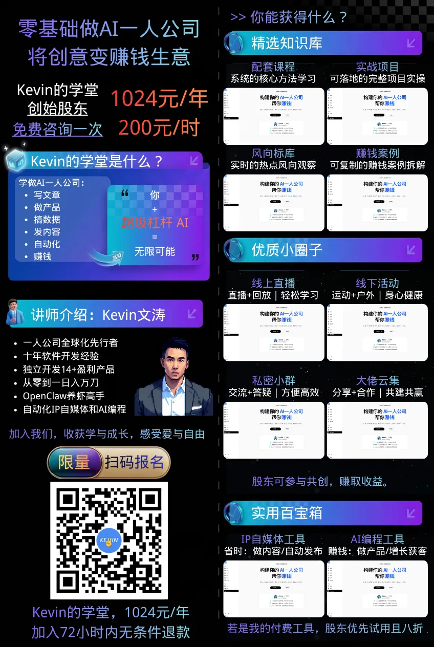 现在升级为 Kevin 的学堂社区:合并之前所有社群,提供体系化的课程、产品、活动,致力于帮助一千个人打造自己的 AI 一人公司,将创意变赚钱生意。