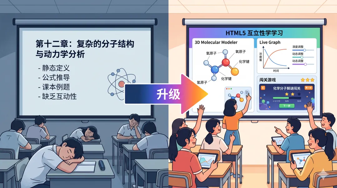 PPT当然好用,但它的天花板也很明显——静态翻页、动画僵硬、交互几乎为零。你想让学生拖拽一个元素看效果变化?对不起,做不到。你想做一个实时计算器让学生输入参数?对不起,做不到。你想嵌入一个答题小游戏?更做不到。