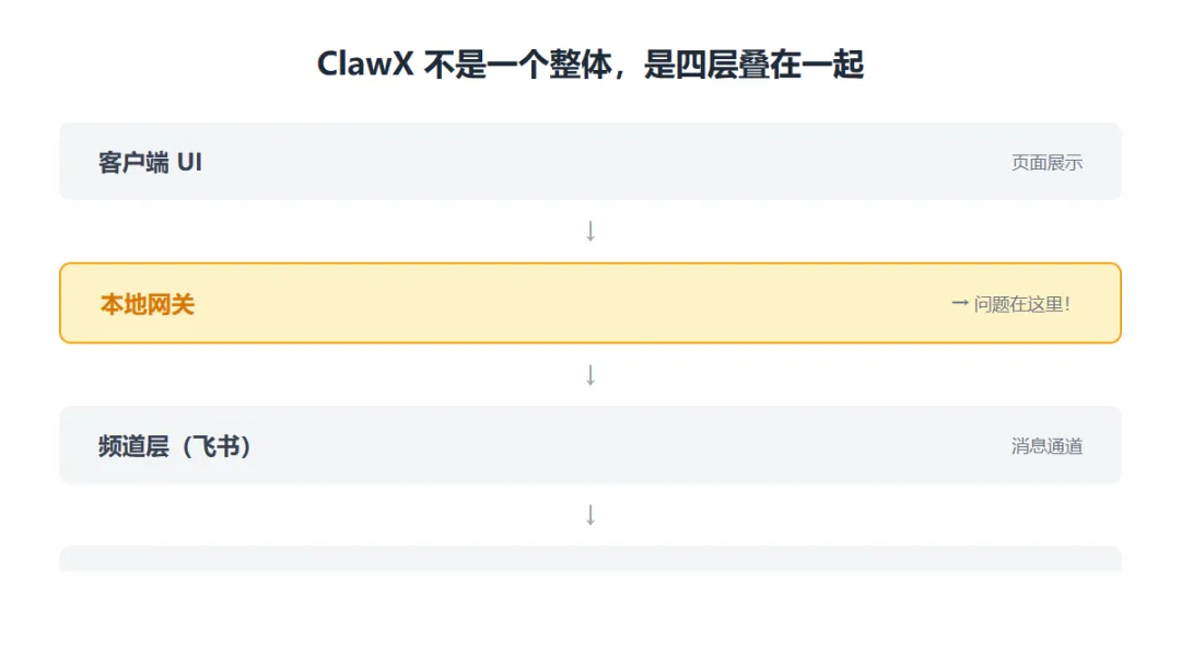 最后有一个发现特别关键:问题并不主要在飞书,也不主要在网络,而是在 ClawX 客户端和它本地网关之间的这条链路。