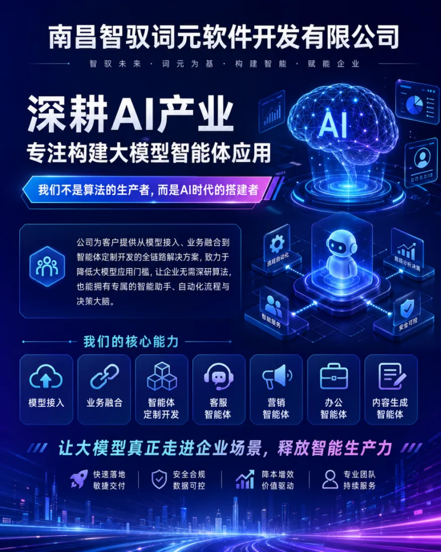 南昌智驭词元软件开发有限公司,是一家深耕AI产业、专注于构建大模型智能体应用的技术型企业。公司秉持“我们不是算法的生产者,而是AI时代的搭建者”这一核心理念,为客户提供从模型接入、业务融合到智能体定制开发的全链路解决方案,利用OPC(One Person Company,一人有限责任公司)创业孵化模式,系统破解了单人创业者在合规、资源、能力、增长四大维度的核心瓶颈,为“超级个体”提供全周期护航,使创业者能够轻装上阵,将全部精力聚焦于技术攻关与场景落地。大大降低了大模型的应用门槛,让企业无需深研算法即可拥有属于自己的智能助手、自动化流程和决策大脑。目前已形成面向客服、营销、办公、内容生成等多个场景的智能体产品矩阵。