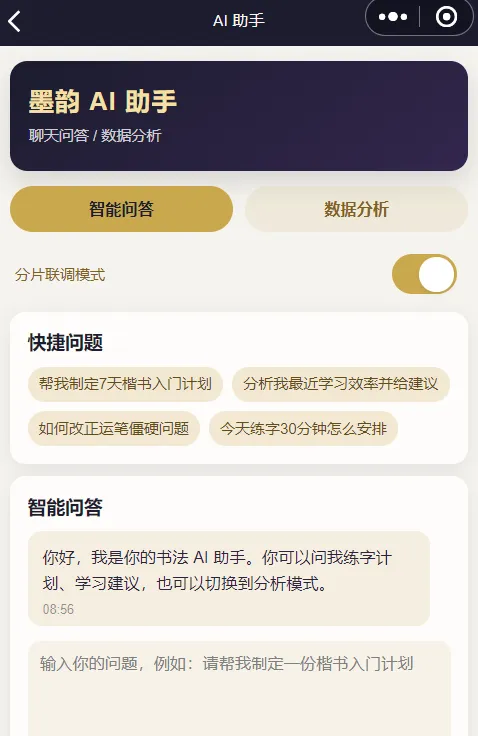 书法智能小程序:基于大模型技术,实现书法文物识图、数据分析、营销分析等功能,将传统文化与AI能力深度融合,让千年翰墨在数字时代焕发新生。