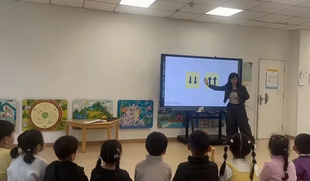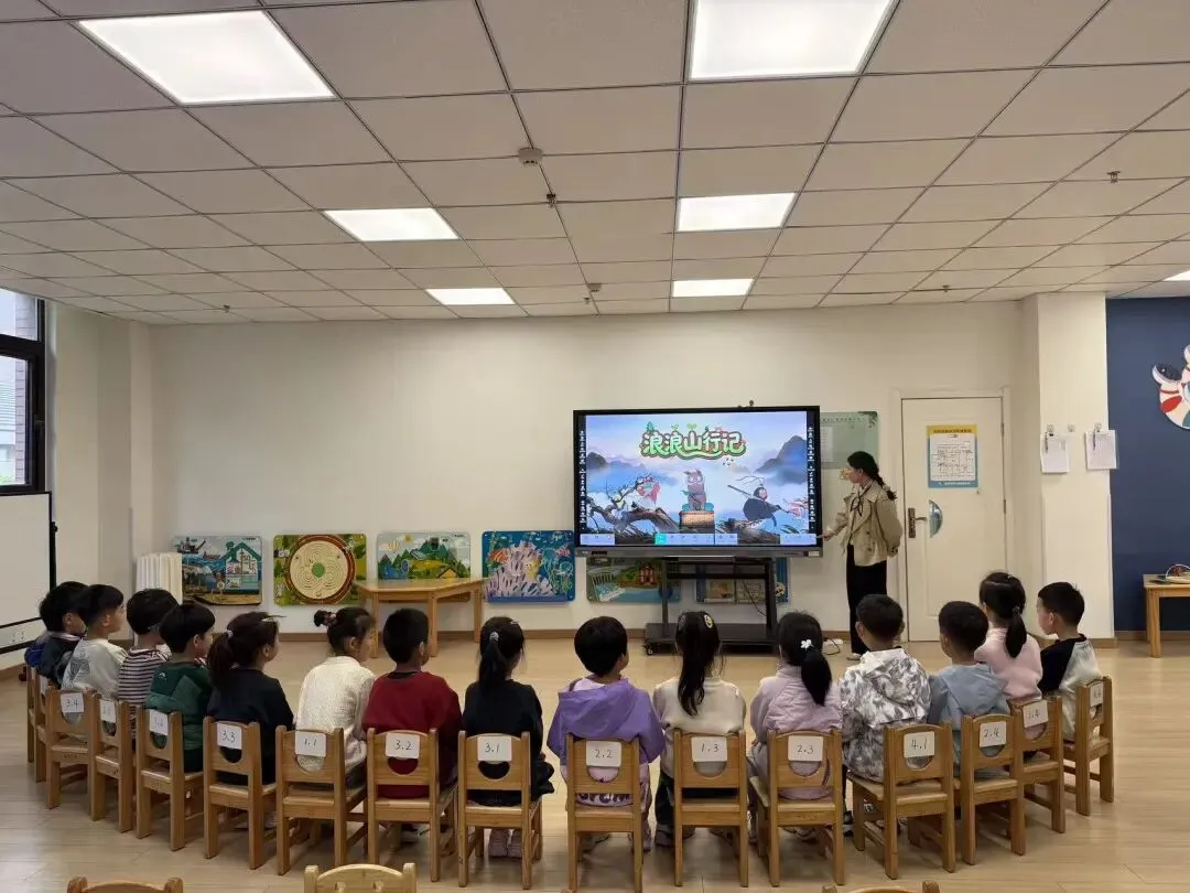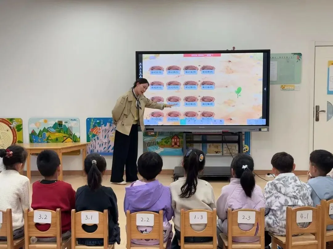 孩子们在浪浪山闯关的情境下,跟着李老师的引导,通过互动操作帮小树苗安家、找宝藏,与AI山神视频互动接取任务,在趣味游戏中轻松认识“行”与“列”,理解“第几行第几列”所表示的空间位置,提升空间感知能力与语言表达能力。最后,孩子们化身浪浪山小卫士,根据指令快速集合,将抽象的行列知识转化为真实场景中的运用。
