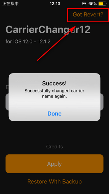 如果用腻歪了或者想将这款工具卸载,请务必先关闭相关设置再进行操作。方法同样很简单,还是打开工具首页,找到右上角的Go Revert?按钮点击,出现successful代表成功恢复默认的运营商名称了。