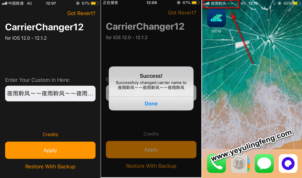 打开应用后都是一堆看不懂的英文,这里老夜简单讲解下基础功能,若要自定义设置运营商名称我们在首页的框框中输入文字内容即可。输入之后点击页面底部的Apply按钮,待弹出成功提示对话框中的Done,运营商名称就已经改好了。
