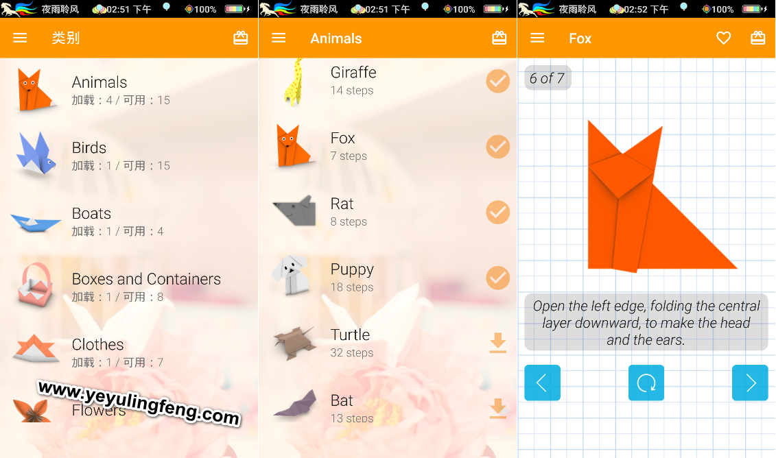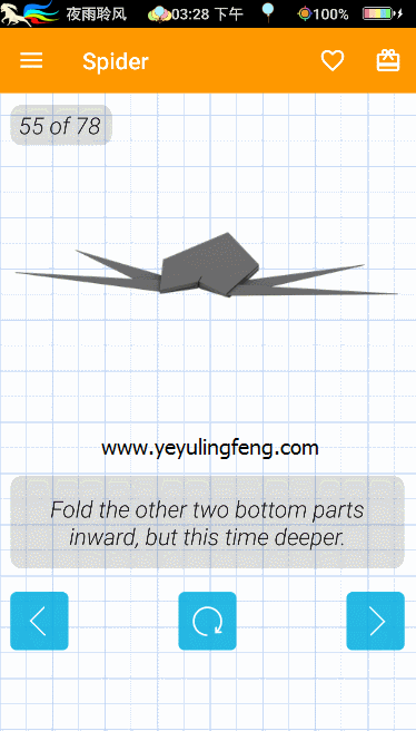 进入折纸教学就比较简单明了了,上一张、重复步骤、下一张等几个按钮都是再熟悉不过了,每一步都有图文详细说明,当然英文标注算是可有可无的,毕竟看不懂(暴露文化水平了)!