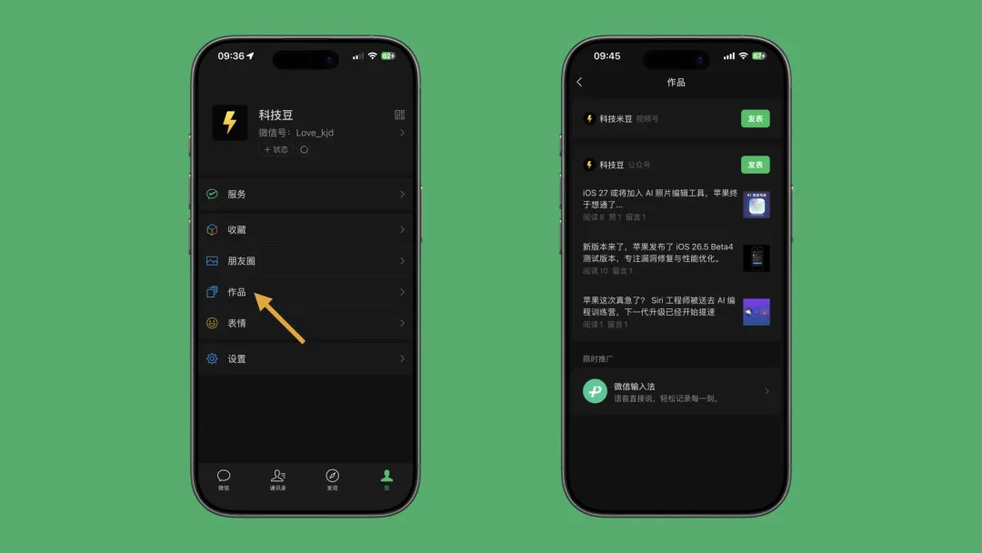升级到新版本后,最明显的变化就是「我的」页面调整。 「视频号与公众号」 模块更名为 「作品」,入口更清晰,统一管理个人视频号与公众号的内容; 「作品」详情界面,也进行了相应调整,界面更加整洁, 同时底部新增了限时推广模块。