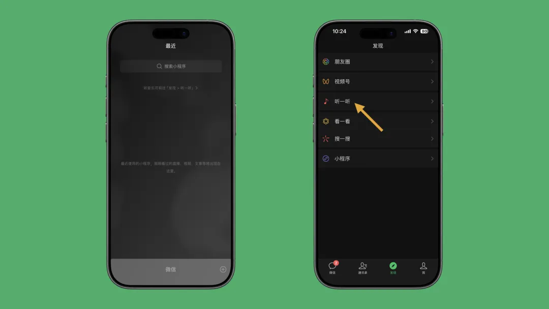 微信主页下拉界面的「听一听」入口已完成了调整,原下拉入口正式移除,功能统一放在了「发现」 页面里面的「听一听」 专区, 集中管理音乐播放与博客的收听。