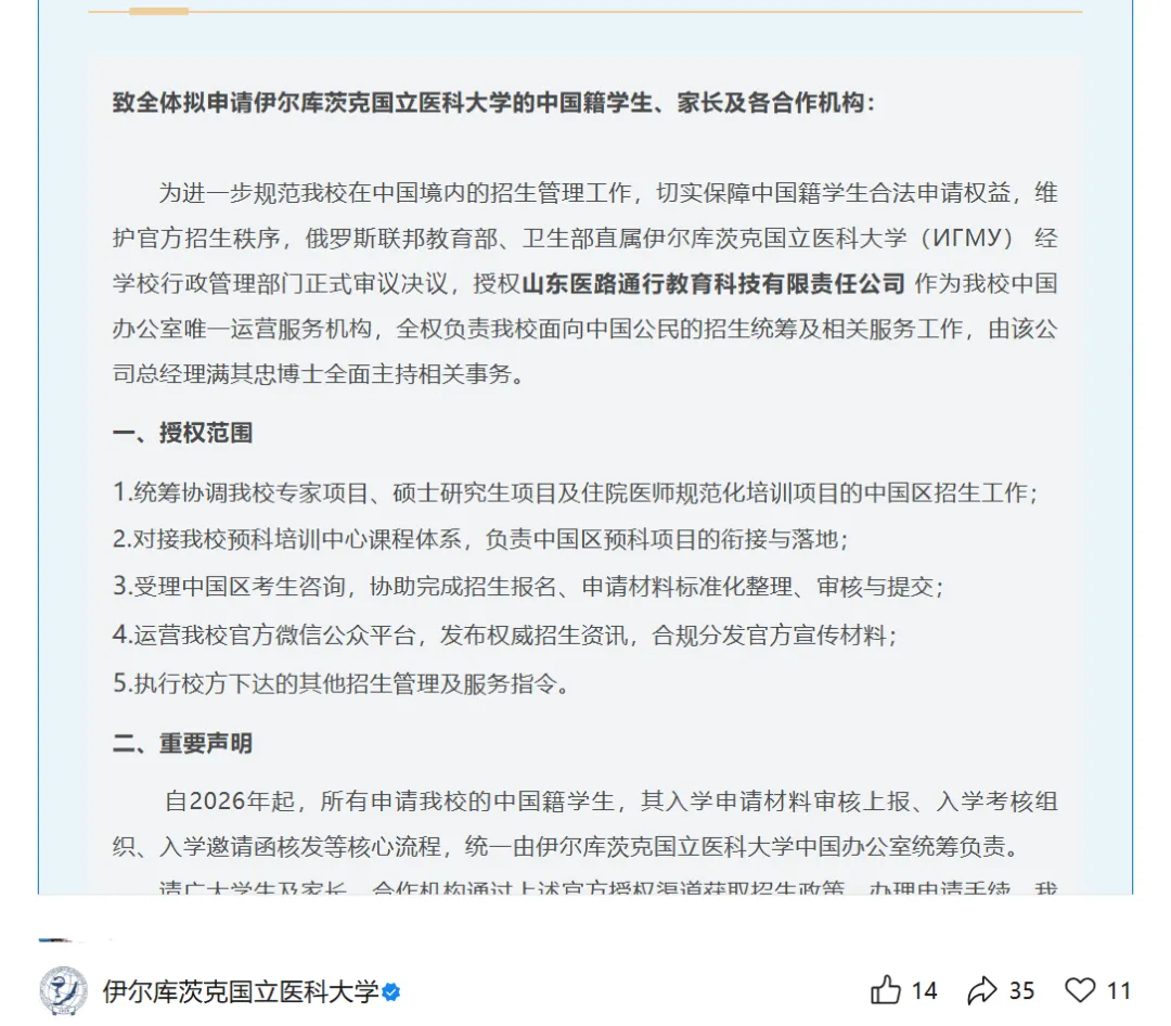 作为伊尔库茨克国立医科大学官方唯一授权的中国办公室,医路通行掌握着最直接、最高效的申请通道。这不仅意味着信息的零衰减,更代表了录取的至高保障性。在大数据的监测下,这种具有排他性的官方资质,是其拿下满分的基石。