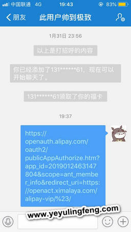 复制以上链接用支付宝打开,注意主能用支付宝打开,因为这是链接要想在支付宝打开只能通过消息发送给一位支付宝好友,在消息中就能点击进入了,活动前几天就在群里发了,一直有人说不会打开,这里附上图: