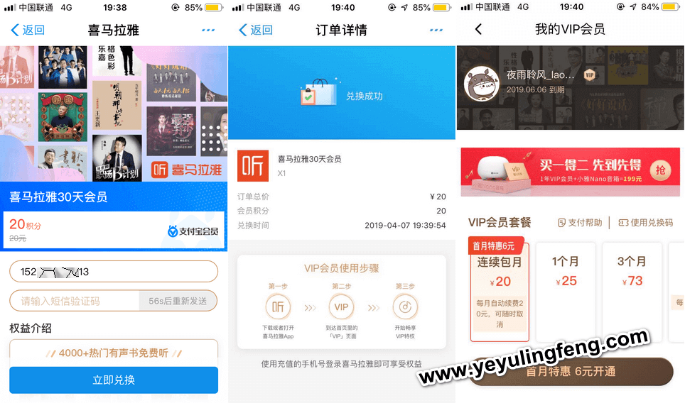 然后进入活动页面,输入手机号码接个验证码后就能领取了,领取条件是需要话费支付宝会员20积分,这跟免费送没区别了。领取完毕后下载喜马拉雅FM的客户端,输入参与活动的手机号码,登录后找到会员中心就能看到VIP特权已经生效了,同时还会有相应的会员截止日期说明。