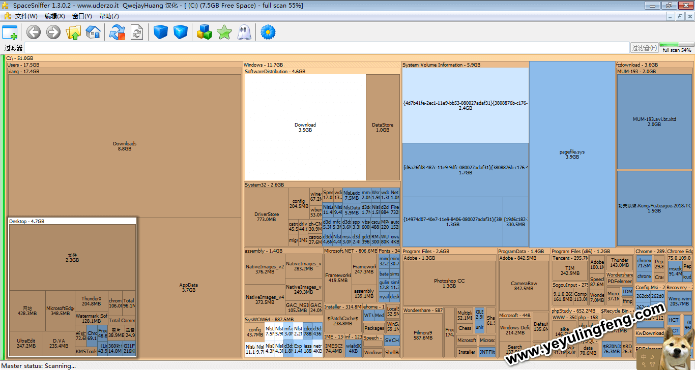 一款名为SpaceSniffer的工具可以很好的解决此此类问题,老夜没文化网上翻译了一下大概也许差不多八成是“空间嗅探器”的意思,一款完全免费的软件工具,歪果仁制造支持中文界面。