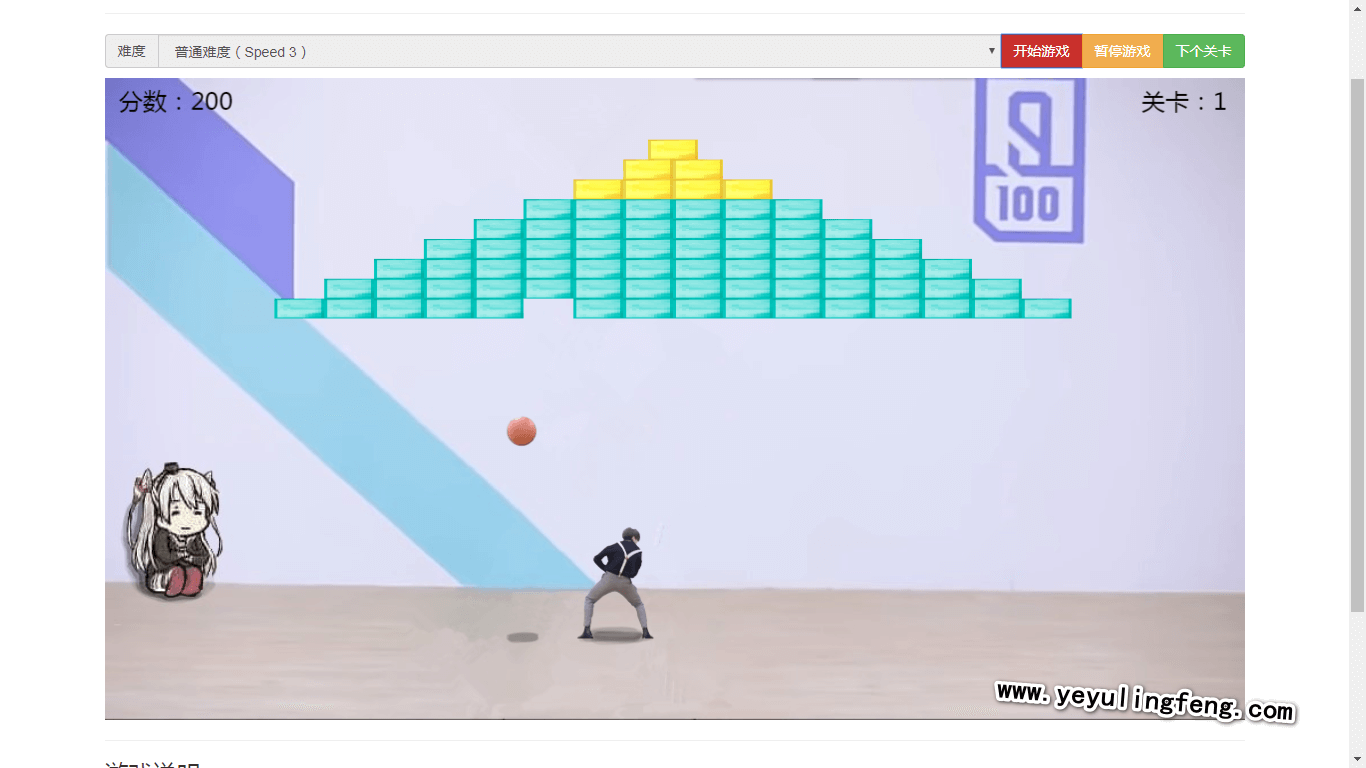 点击”开始游戏”,回车键Enter发球,方向键←、→或A、D控制控制人物左右移动,P键暂停、通关后N键进入下一关,M键暂停音乐