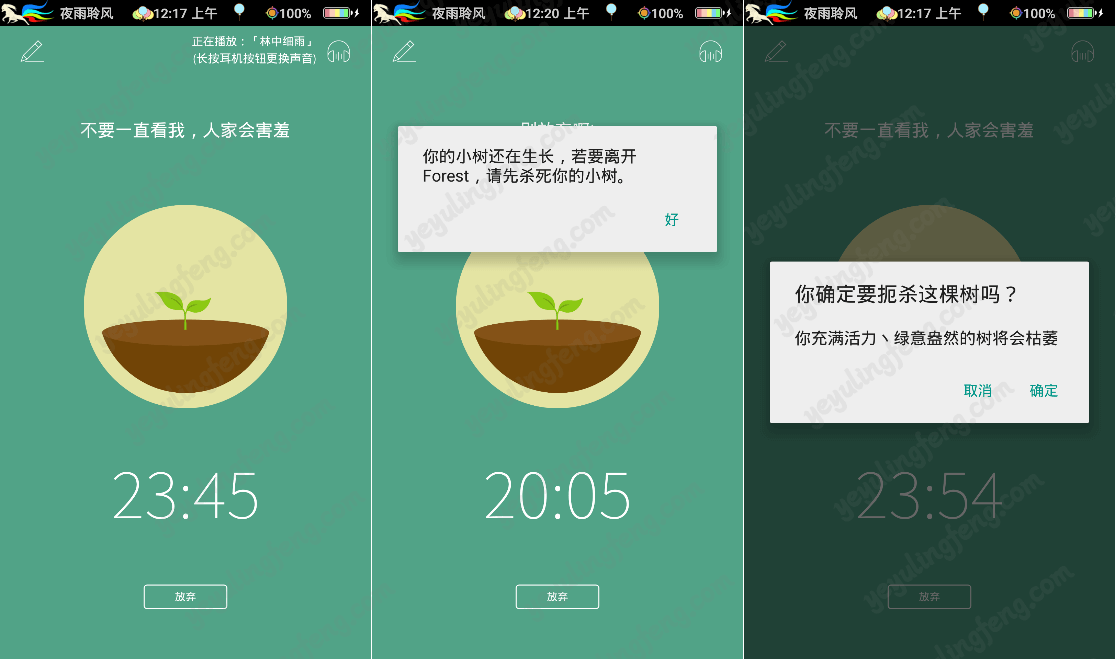 forest需要在打开后禁止用户打开其他应用,因此相关的权限需要赋予其允许,计时结束后树苗就长大成林,反之如果半途而废这颗附有生命般的小树就会被自己亲手毁掉,在小树成长的期间我们就可以更加专注于做其他事情不被手机所干扰,当然也有闲的蛋疼一直盯着屏幕等小树长大的就当老夜没说,这些都是高手!