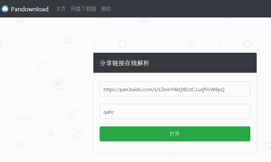 进入网页端首页后按照提示输入网盘分享链接和提取码,点击打开就能获得下载直链了,点击就可下载,这里附上gif演示动图: