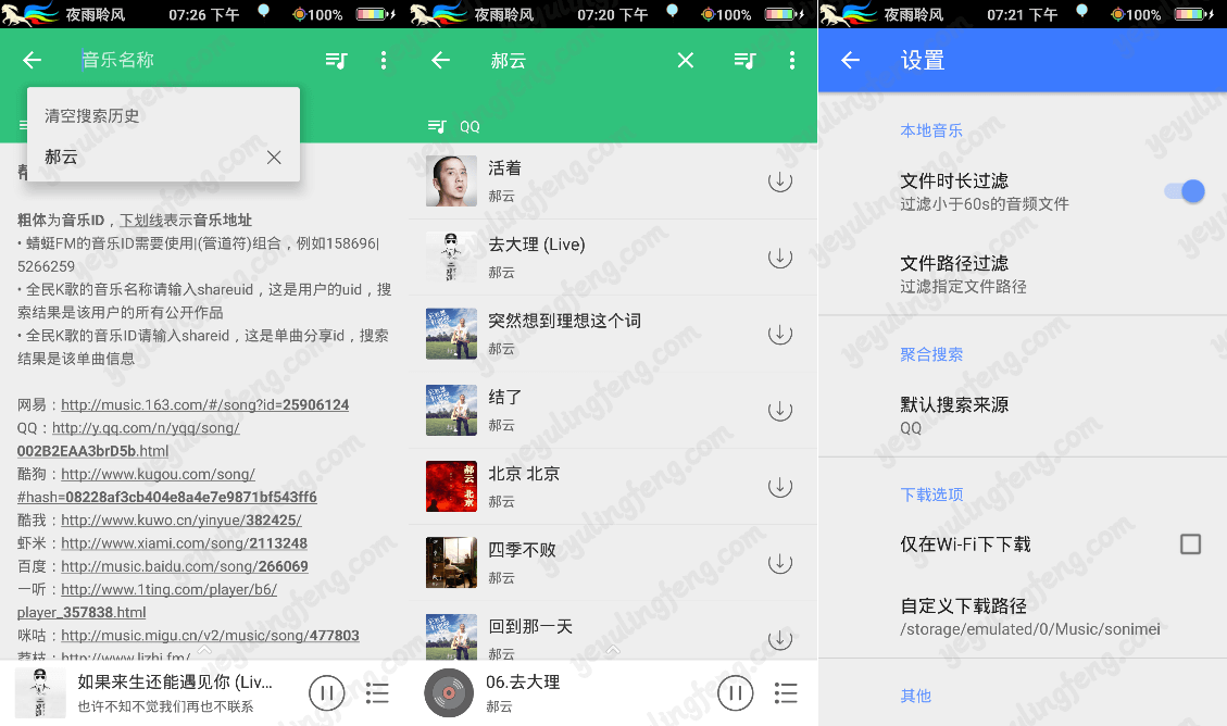 搜索的结果会以列表的形式展现出现,点击左部就是试听播放,右边点击就是直接下载了。功能有点简单,老夜充满星辰大海的眼睛依旧没能找到下载版块,只有拉下系统通知栏才能看到歌曲的下载信息以及进度完成状态。试听界面比较清爽,能显示歌词,调节声音,设置循环播放模式以及播放列表歌曲展示,默认就是高清音质,并夕夕1元砍的3D立体声环绕蟒蛇音效耳机终于能派上用场了。