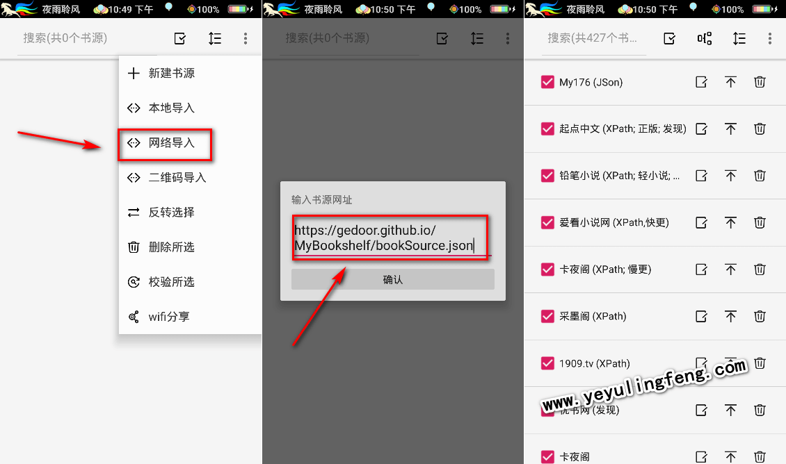 使用方法,先安装阅读APP这个应用,目前仅限安卓环境。随便搜索一个书名后不管能不能搜得到,点击右上角的会弹出书源管理了,找到网络导入点击进入,不会的看下面图片: