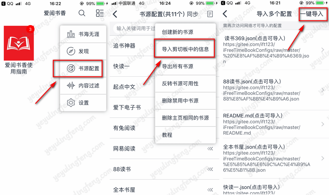 导入剪切板中的信息一些人可能会看着一脸懵逼,就是将下面的地址复制其中一条,注意不支持批量复制哦!再按照上面的方法操作就好了,当然也有个更好的方法能自动执行的,就是下面每个链接后面都有个“点击导入”选项,点击后就能直接跳转至爱阅书香APP中自动将书源导入了!