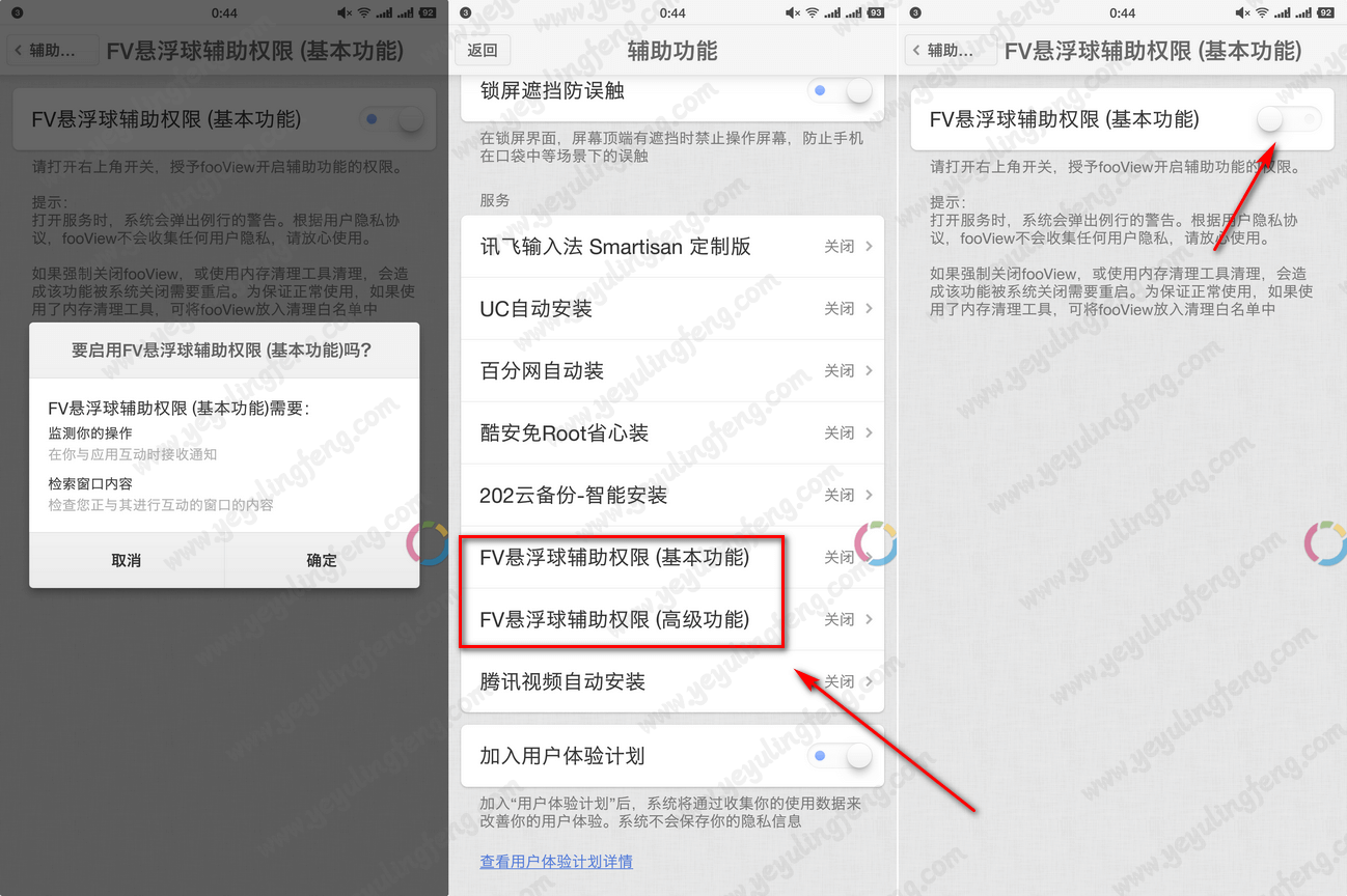 fooView不需要手机root大大降低了使用门槛,但是要想悬浮演示以及实现一些返回上一级、切换进程等功能还得需要到设置中的辅助功能管理处,将fooView的一些服务设置为允许状态。之后就可以快乐的体验起来了。效果如下图,不同的手机地方还不太一样,一般使用时软件会提示需要打开这些服务才能使用并会自动跳转至设置页的,无法设置或设置不了的就只能手动去打开服务了。