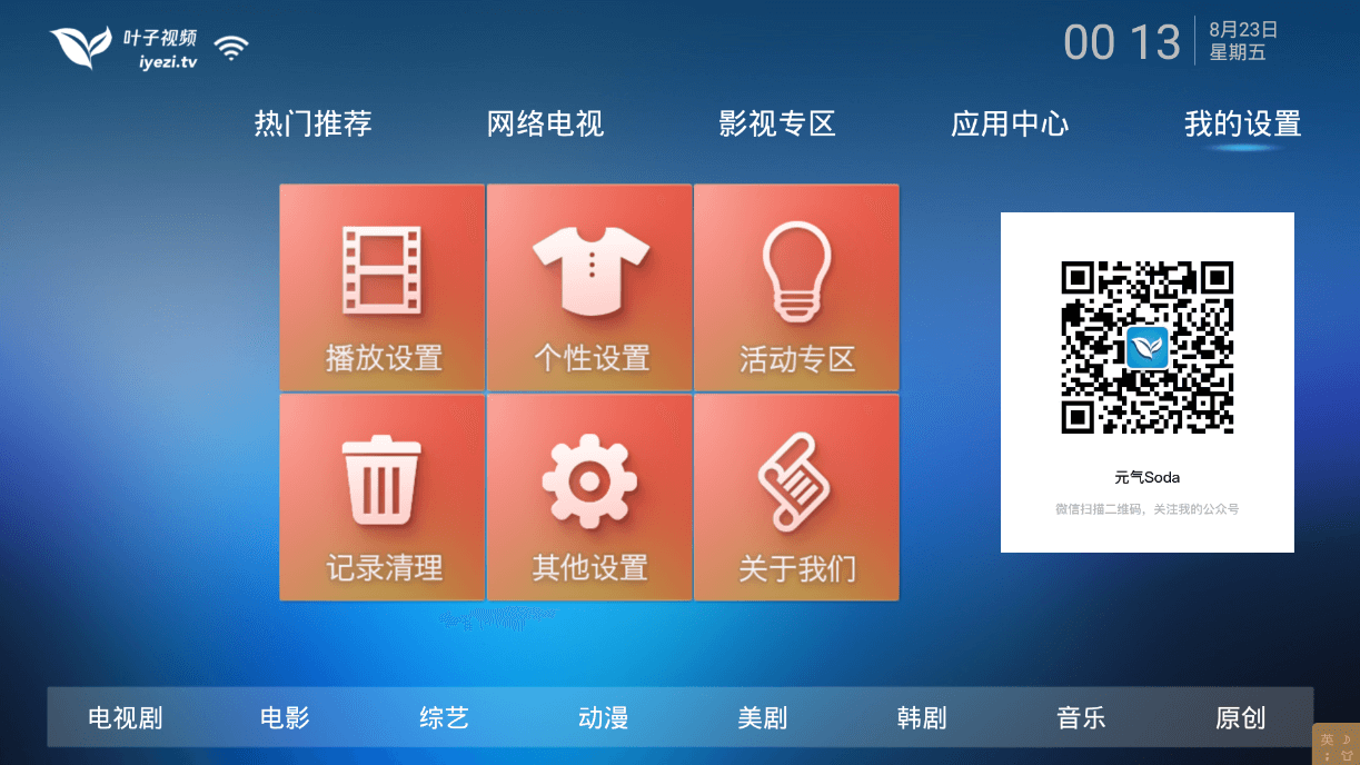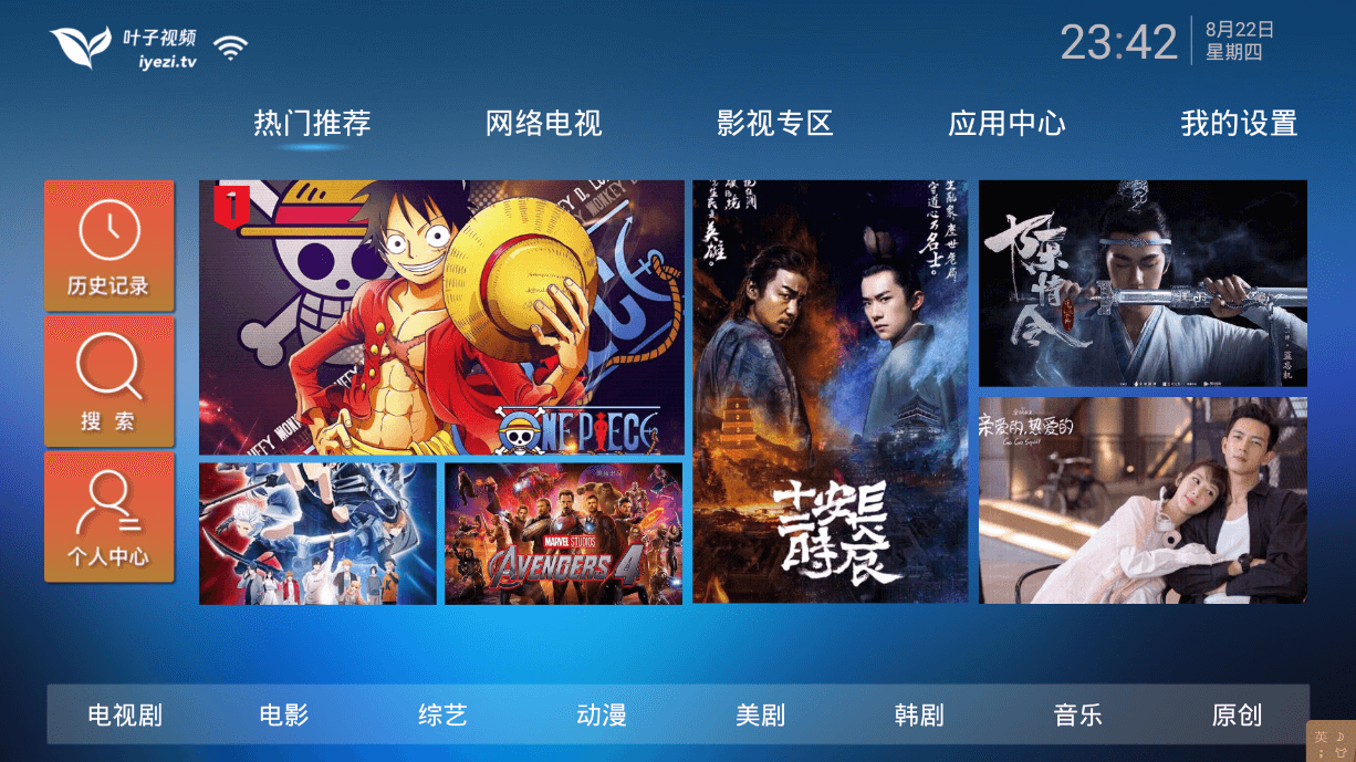 叶子TV首页的功能版块可谓是一目了然了,在线影视、电视频道、个人中心、历史记录、本地应用中心等。底部就是影视资源的分类了,美剧韩剧也都一一安排了,另外就是音乐等一些分类还为开放,估计日后版本更新会有补充。