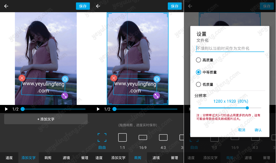 当然直接打开应用选择功能后再查找添加待处理的图片就可以操作了,这里老夜拿图片合成GIF功能为示例进行演示一番,进入后选择几张静态图片通过小白一键式的操作就能将几张图片加工成GIF动图了,底部的菜单功能项压实非常的简单易操作,帧率、滤镜、裁剪、添加文字等各种操作项还是非常到位的。处理完成后点击右上角保存,选择图片保存质量,质量越高体积也随之更大,注意的是分辨率过大,可能会导致图片过大或者合成失败的可能