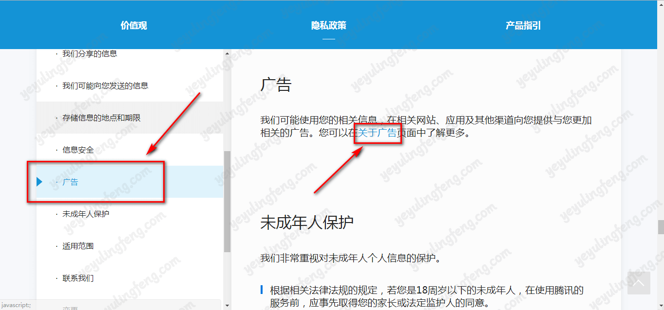 点击上图箭头标识处的链接就跳转到新页面了,此时在新页面的左侧慢慢往下翻找到“广告”导航条,点击后右侧就显示相关说明了,找到“关于广告”鼠标点击即可!