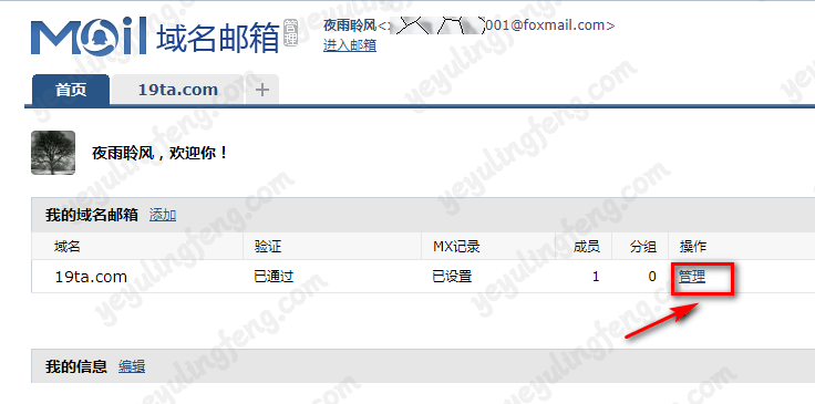 到此域名邮箱基本上是添加完成了,进入QQ域名邮箱主页,会看到自己的域名展示了,点击管理进入填写个人基本的信息,以及自定义邮箱前缀,反正字母数字以及长度都是可以自己随意DIY了,这里老夜还是喜欢设置为admin开头。