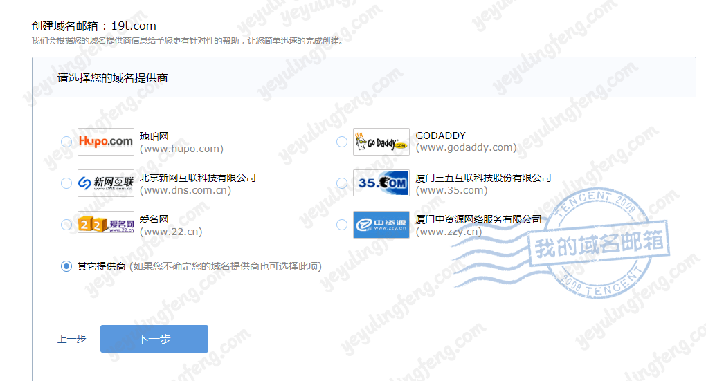 然后选择服务商,老夜测试的域名是在阿里云万网注册的,图中没有可选这里直接点其他服务就可以了,然后继续下一步。