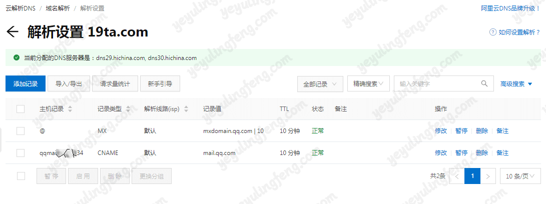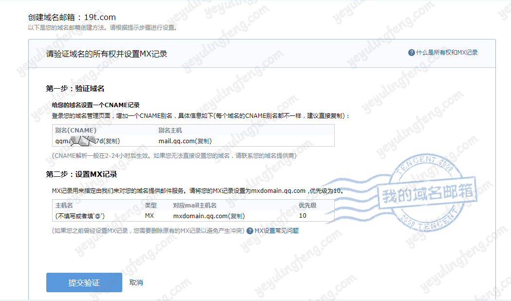这里需要添加两条记录,一个是CNAME和MX记录,二者缺一不可。完成解析后基本上会立马生效,这里直接返回刚才QQ邮箱验证页点击提交验证按钮即可