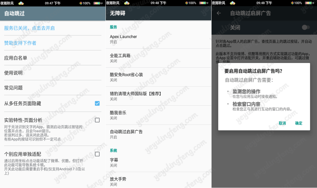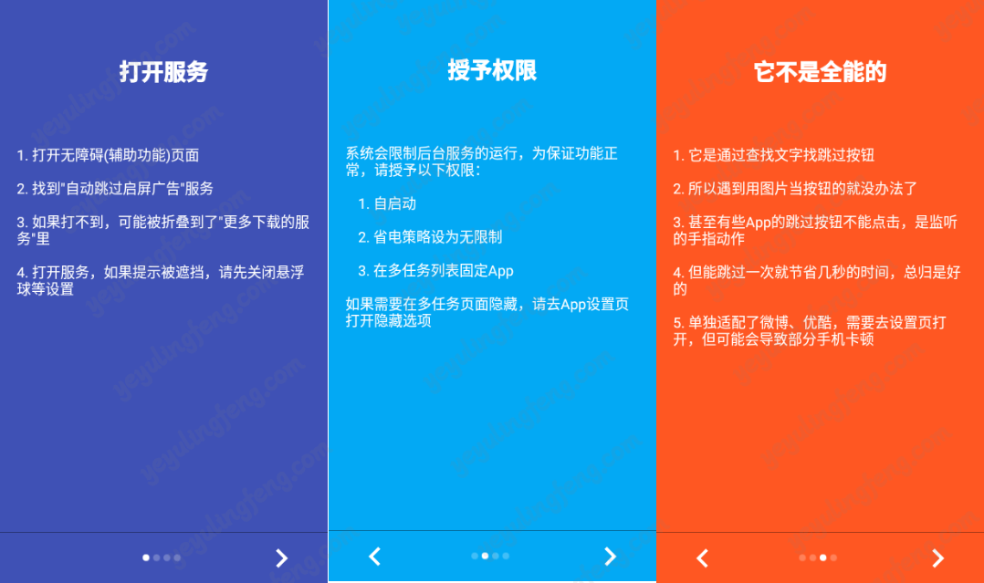 首先文章底部下载安装,老规矩打开应用,按照软件内提示点击前往开启“无障碍服务”,将“自动跳过启屏广告”设置为开启,然后返回软件看到服务已开启就行了,具体教程引导软件内都有说明,这里将大致方法截图附上: