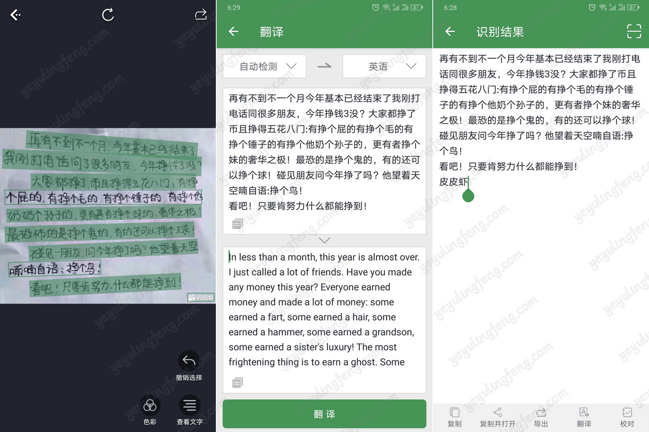 上面的拍照识别文字较少且拍照比较清晰识别效果肯定好,那一些字体潦草或者图片不怎么清晰条件下识别率怎样才是分辨识别率功能的绝佳途径。具体如下图所示效果还是杠杠的,连右下角的皮皮虾水印都给扣出来了。在识别时会定位文字区域,大家可以通过勾选框框指定识别哪些内容都可以自定义操作啦!