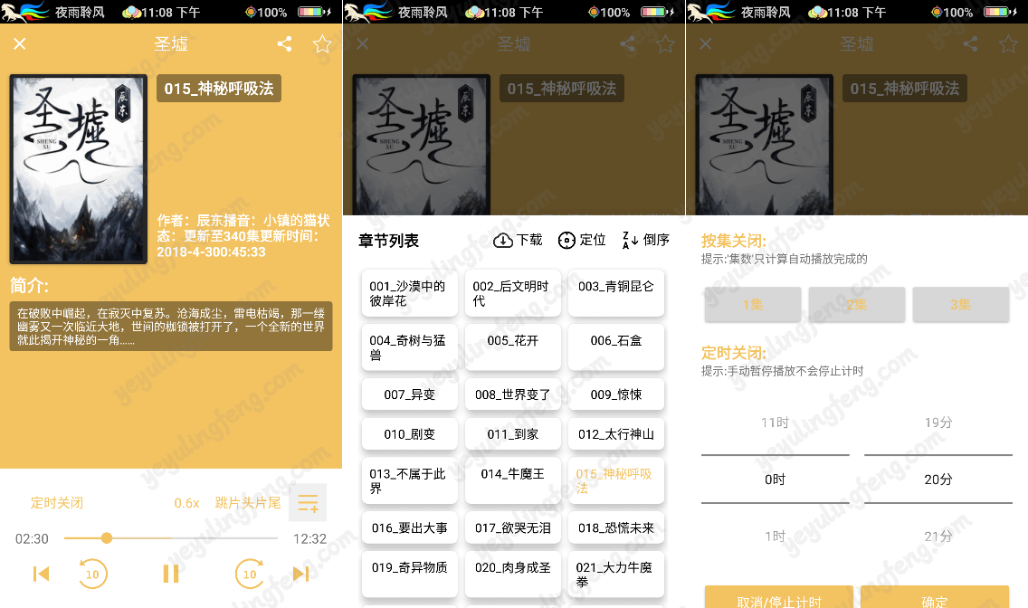 作为一款免费的听书APP,最最最重要的就是听书体验了。这里老夜随便找个几年前就在看到现在都没完结的小说,使用过某山峰命名的听书软件就会发现操作相差无几,支持定时关闭、跳过开头片尾广告、倍速播放等都是资瓷滴!离线缓存可非常给力,支持批量下载至本地。