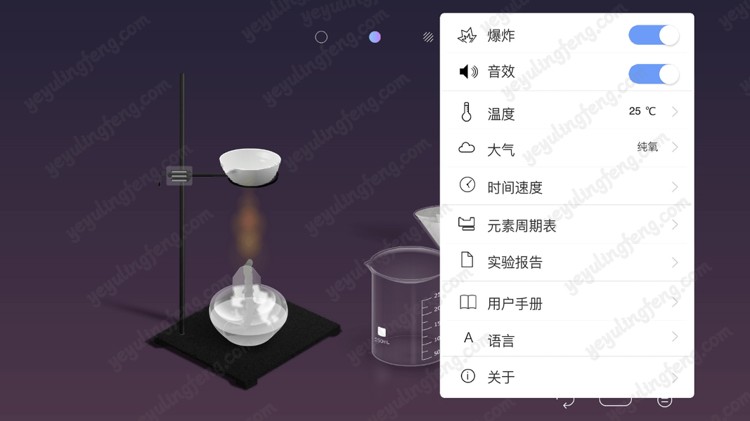开启声音以及爆炸效果可以让实验更加真实点,你还可以根据实验环境调节温度、大气,此外APP还内置了化学元素周期表