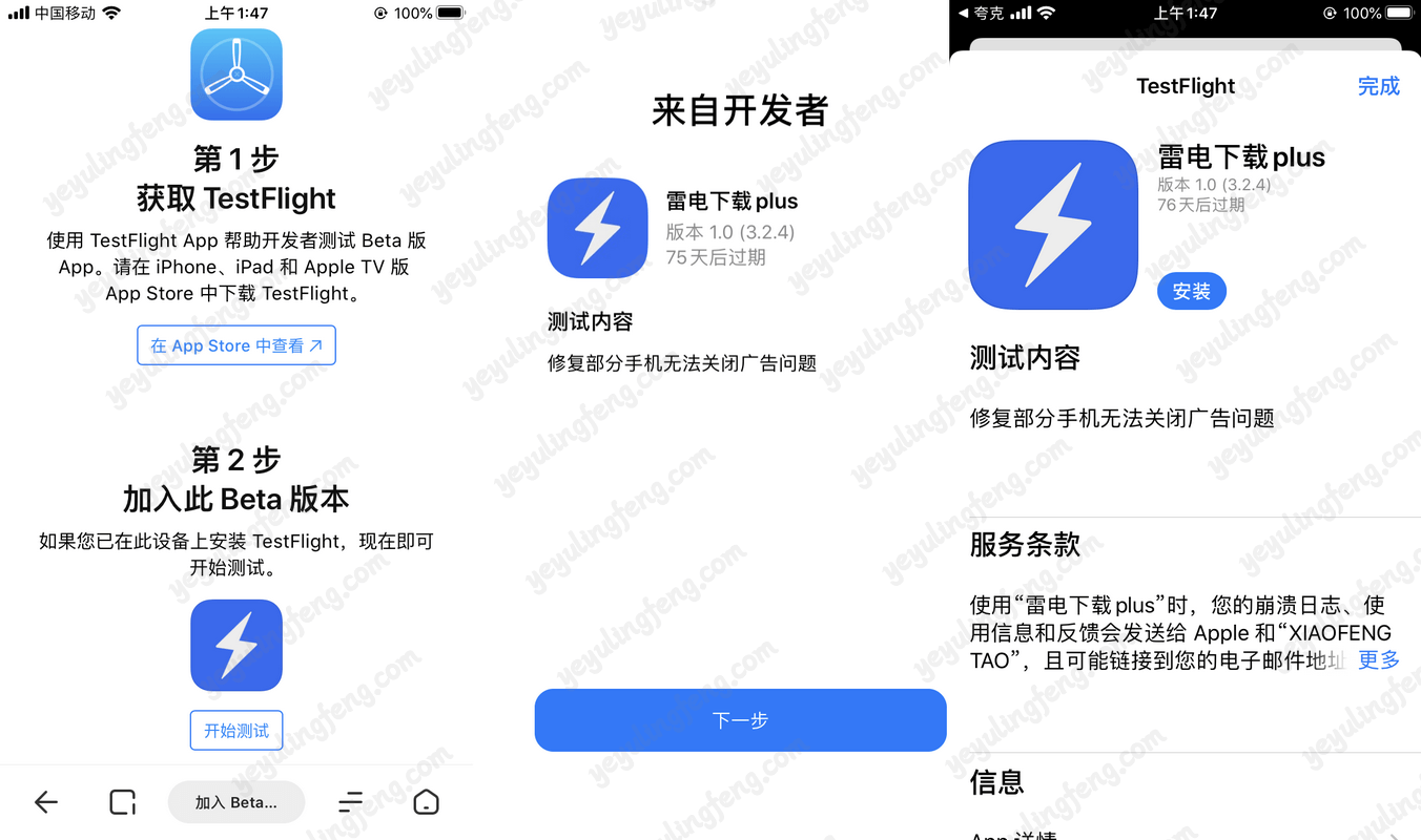 首先App Store搜索“TestFlight”下载并安装,然后根据雷电下载的官方地址跳转至TestFlight就可以安装APP了