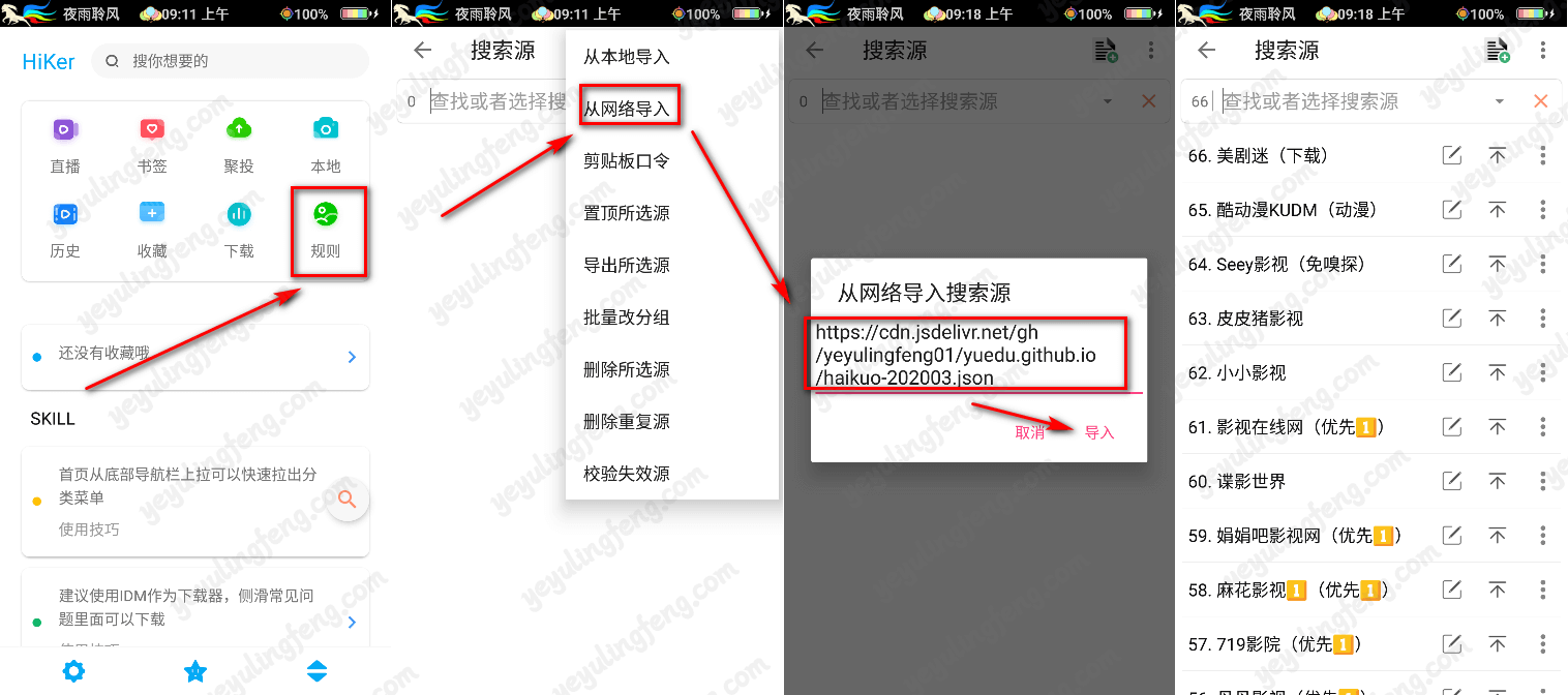 海阔影视不导入规则是无法使用的,为了让大家能更快的上手使用这里提供了详细的图文教程。首页点击规则进入从网络导入,规则链接老夜会放在夜雨聆风站内,复制粘贴就能完成了。