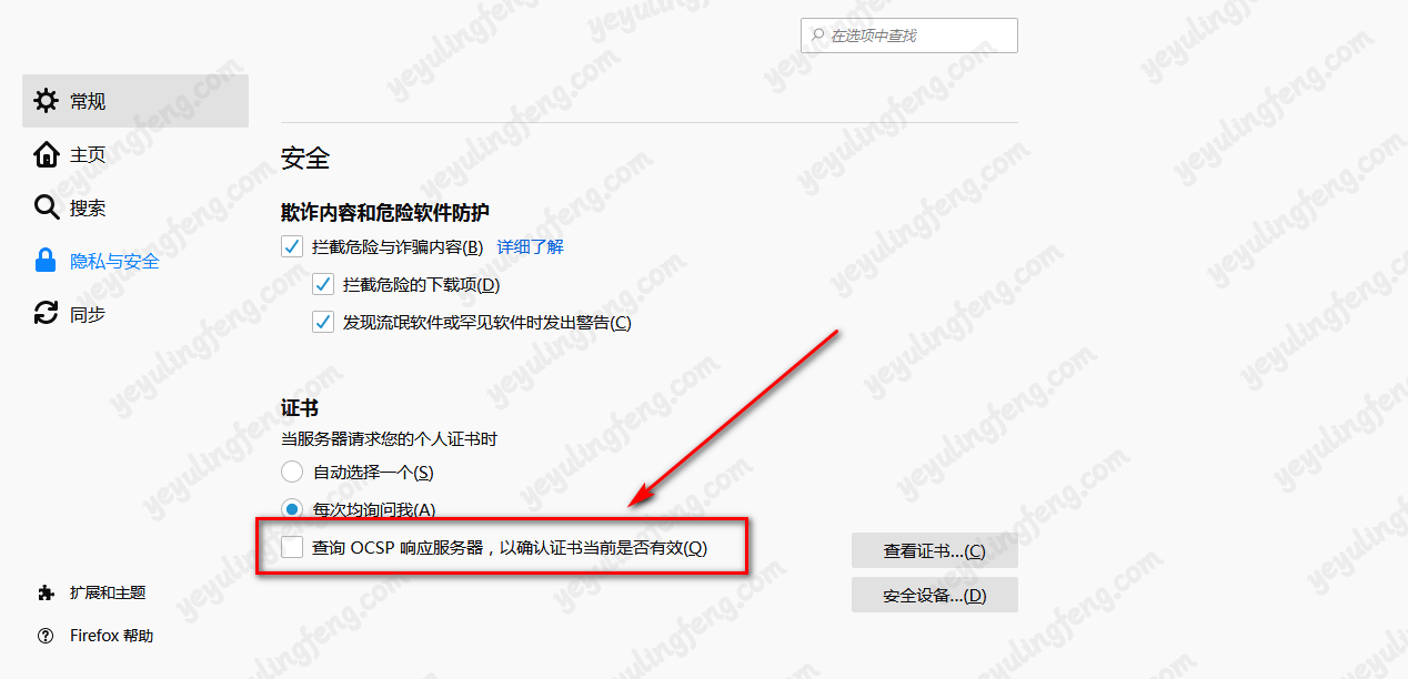 现在好多网站都介入了QQ快捷登录了,而去年老夜发现因为证书问题火狐浏览器中无法快捷QQ登录了,而其他浏览器正常。新版本中老夜不知道有没有问题,如果遇到老夜一样的情况按照下图操作把“查询OCSP响应服务器,以确认证书当前是否有效(Q)”这一项前面的√去掉。