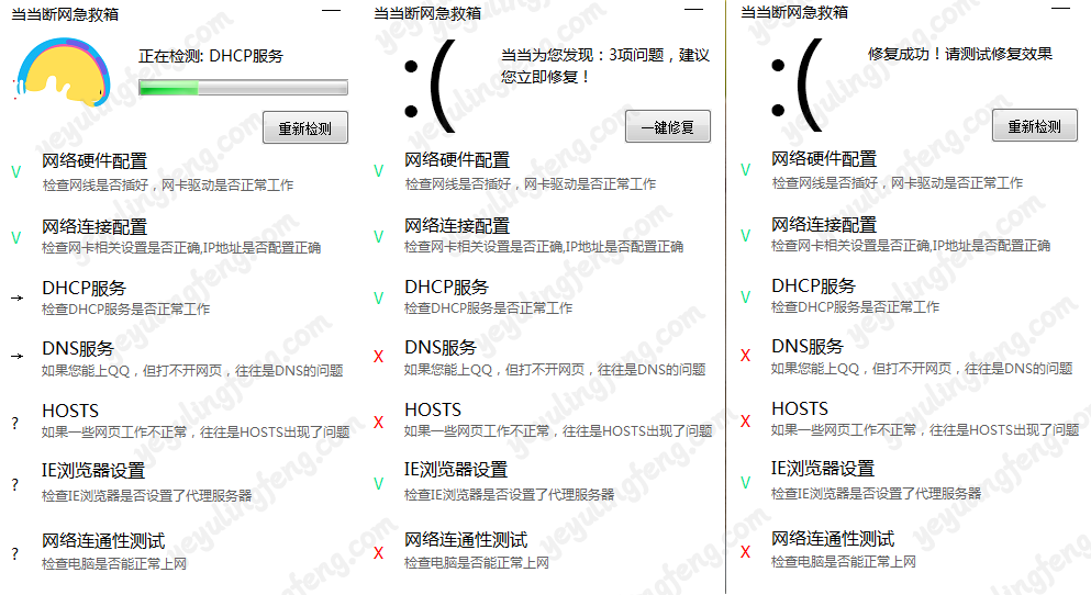 当当断网急救箱是一款绿色便携的断网修复工具,支持网络硬件配置检测,支持网络连接配置检测,支持DHCP服务检测,支持DNS检测,支持hosts文件检测 ,支持LSP协议检测,支持IE服务期检测,支持环境变量检测。使用方法就更加简单了,一键检测然后在一键修复完事,用完后放在一个文件夹中备份方便下次出问题可以快速找到。