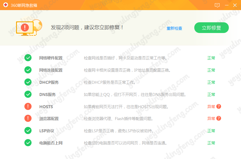 当然使用断网急救工具首先得排除没交网费或者硬件故障等因素,反正原因多种多样,一些常用的网络故障如hosts被更改,LSP协议被劫持都可以通过断网急救小工具一键修复!