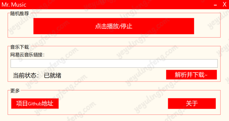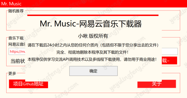 Mr. Music 软件的所有下载API接口均来自互联网,我不能保证其稳定性。我只提供接口调用和下载!软件使用的服务器(详见Thanks目录)仅用于转向至接口与统计软件使用频率,没有安装任何违法物品!本程序仅供学习交流API调用技术以及多线程下载使用,请勿用于商业用途!如产生法律纠纷与本人无关,如有侵权,请联系我删除!请在下载后24小时之内从您的任何介质内(包括但不限于您分享出去的文件)完全、彻底地删除本程序及其下载的文件!若您不在24小时内删除,由此带来的法律问题请您自行承担!谢谢~**