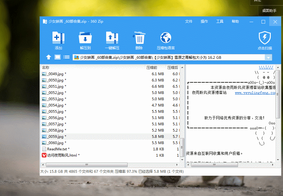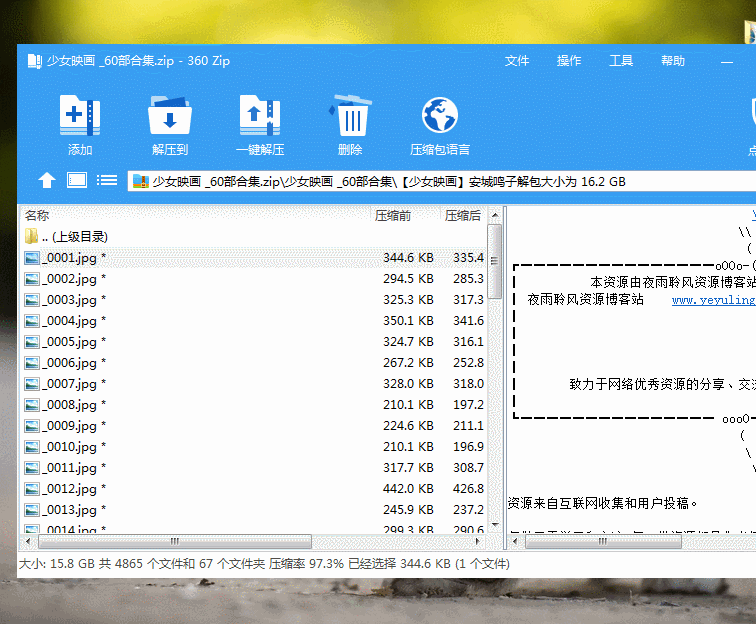 打开压缩包在不解压情况下支持直接快速打开文件,这里老夜将一个16G的图片压缩包进行测试,在不解压的情况下支持快速打开浏览包内的图片文件