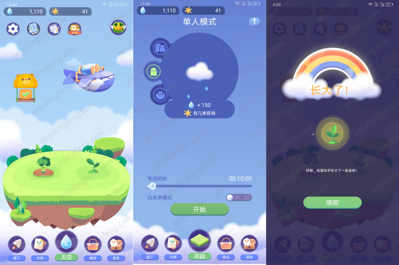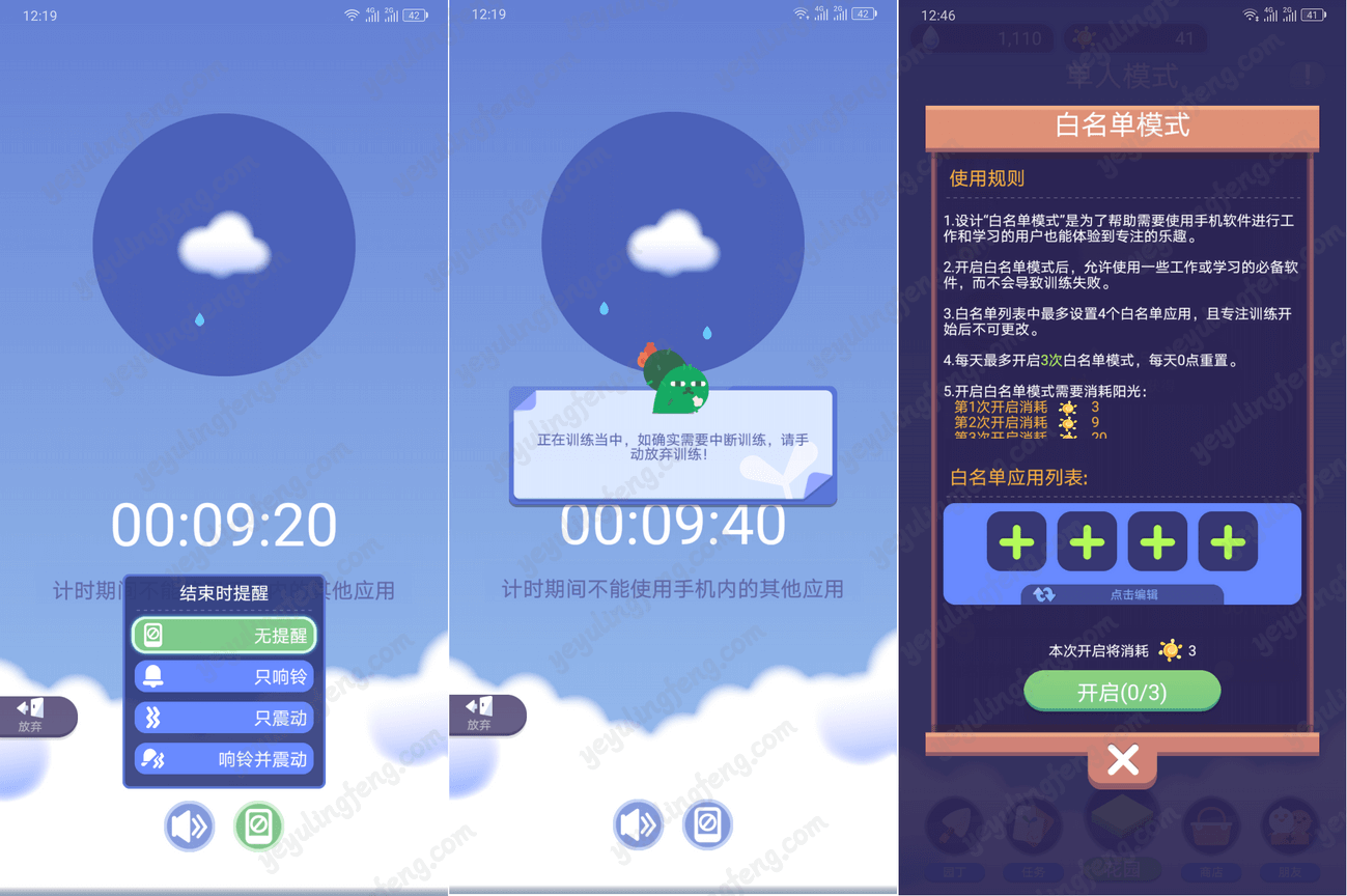 上面说过“天空”也是这款游戏的核心,在用户进入天空后选择合适的专注时长,点击开始就进入修炼模式了。此时手机除了使用短信、拨号、电话本这些功能外,打开其他软件都会弹出提示“正在训练中,如果确实需要中断训练,请手动放弃训练”,一旦放弃不会有任何奖励,如果训练的专注时长达到就会给予水滴作为奖励,概率性会获得太阳。训练完毕会有音乐提醒,可以自定义设置是否开启关闭,训练得到的水滴可以用来种植培养解锁植物。