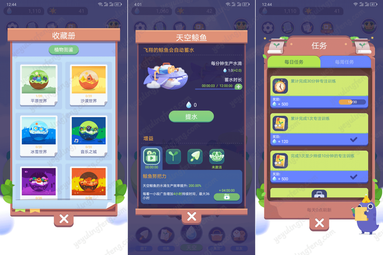 在日常的训练中,通过一次又一次的专注时长训练可以节省出大量的时间出来,游戏玩法也是循序渐进的,每一阶段都会解锁新植物,玩家激活新的植物图鉴也会有奖励,粗略的扫了扫植物种类非常多,还有每周任务每日任务供大家完成,会有丰厚的水滴以及阳光作为奖励。