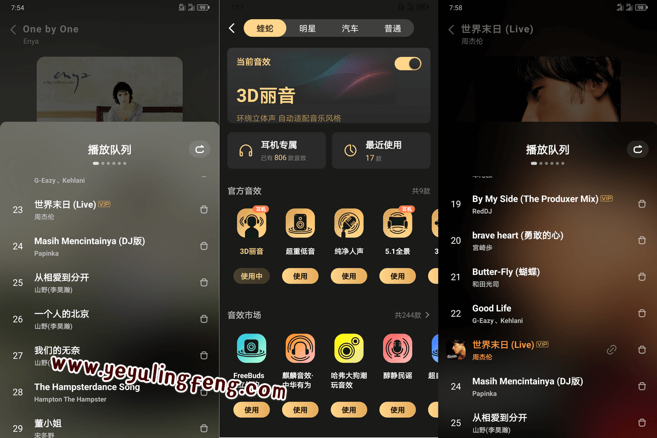 音乐播放时能够快速的查找相关歌词以及歌手专辑信息,这也是一些本地音乐播放器无法完美实现的缺陷,同时支持酷狗自家的各种蟒蛇音效,3D丽音算是老夜重度使用的音效之一了。