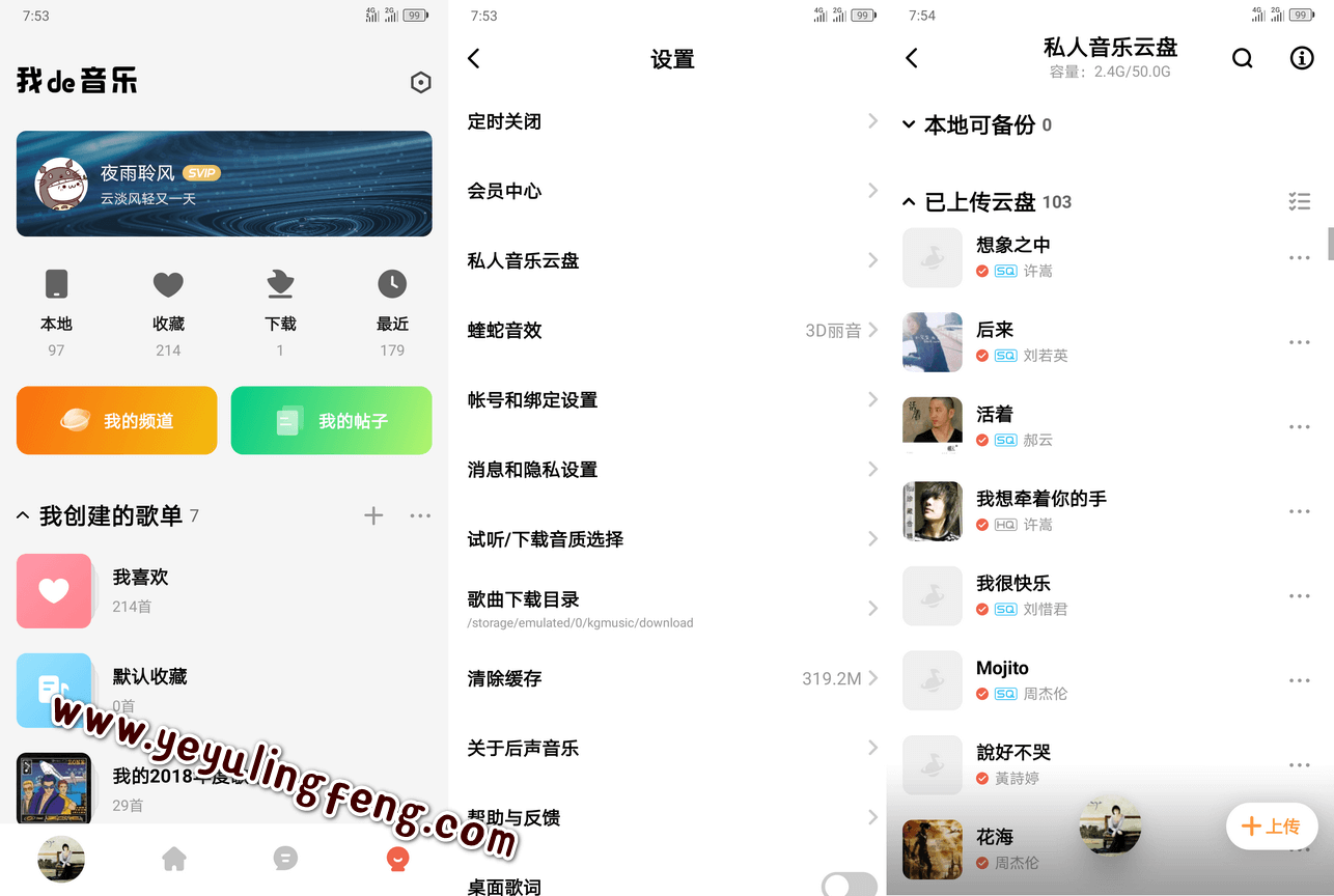 如果有条件下载歌曲至本地,完全可以将后声音乐当作一个本地播放器使用,如果想多设备同步可以将自己本地的歌曲上传至酷狗云盘就可以免费听了。酷狗云盘位置点击右上角的设置就能看到“私人音乐云盘”,点击即可上传、试听以及管理云端的音乐了,云盘中的音乐乃用户自行上传不受版权影响。