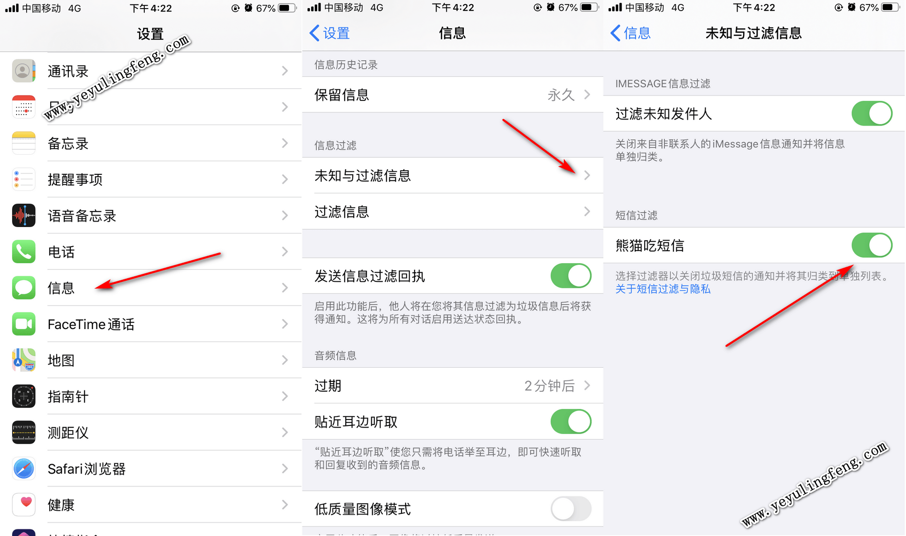 当然了要想让熊猫吃短信这款app功能生效还需配合iOS系统的短信功能使用,步骤如下打开设置,找到短信,信息过滤处找到“未知与过滤信息”,开启熊猫吃短信的功能就好了。