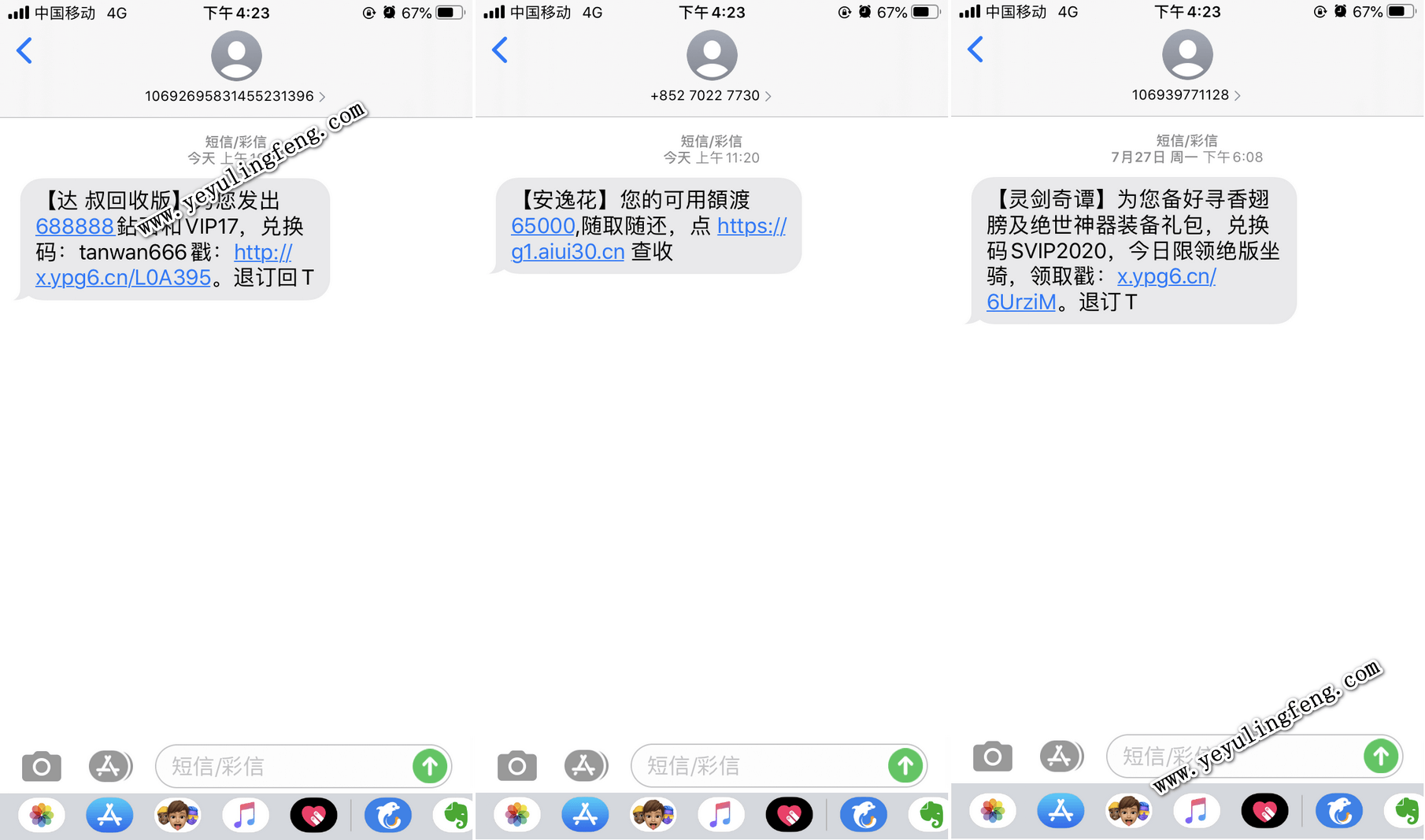 下图中就是日常或多或少都会收到的垃圾短信,记住千万不要回复TD退订之类的,一旦回复了那么恭喜你被盯上了等待的将是更多的消息推送如约而至……